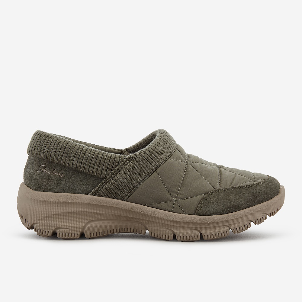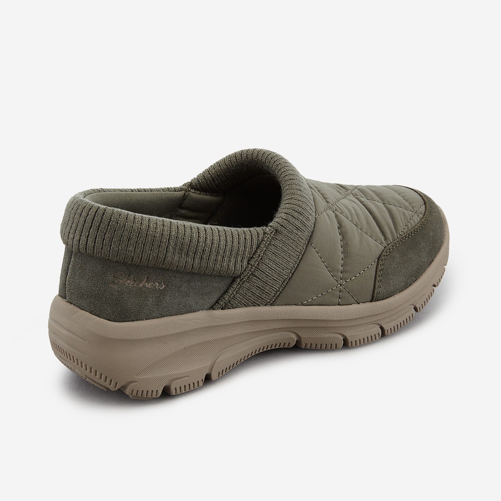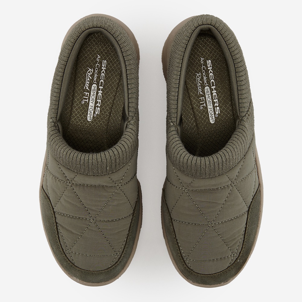 스웨이드 소재 콤비로 따뜻한 분위기의 여성 패딩 슬립온 / 신발 입구 부분에 립 형태의 니트 소재를 적용하여 부드러운 착화감과 편안한 탈, 착화 서포트