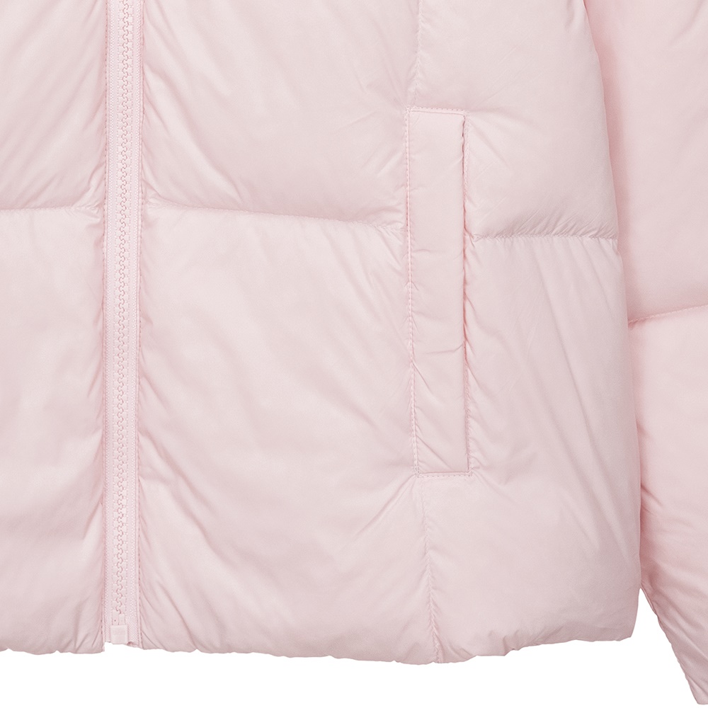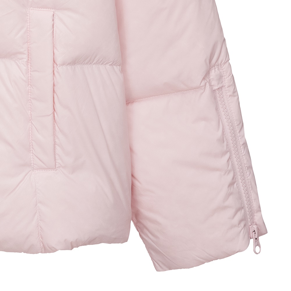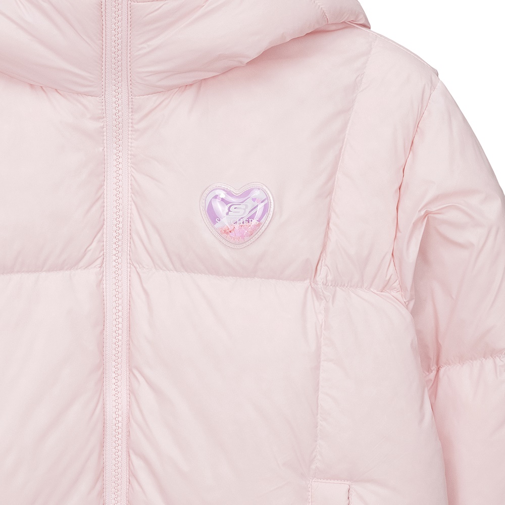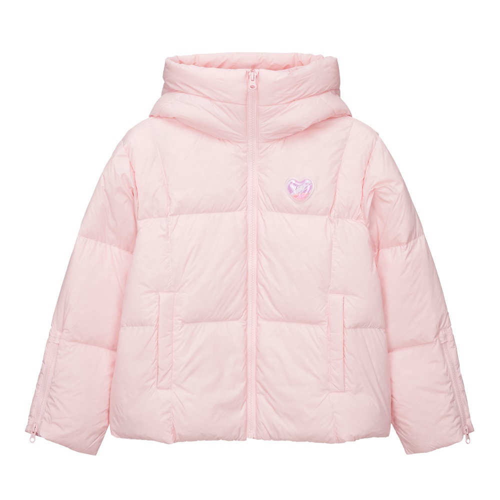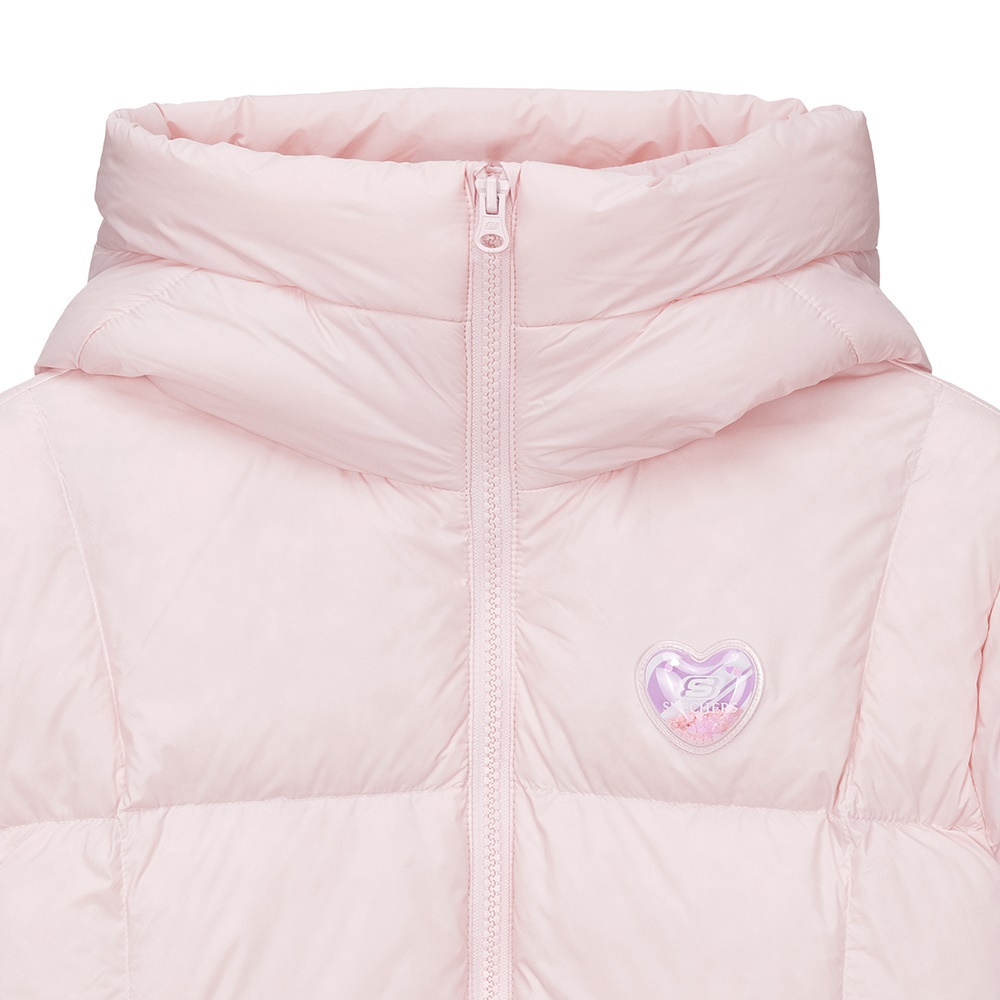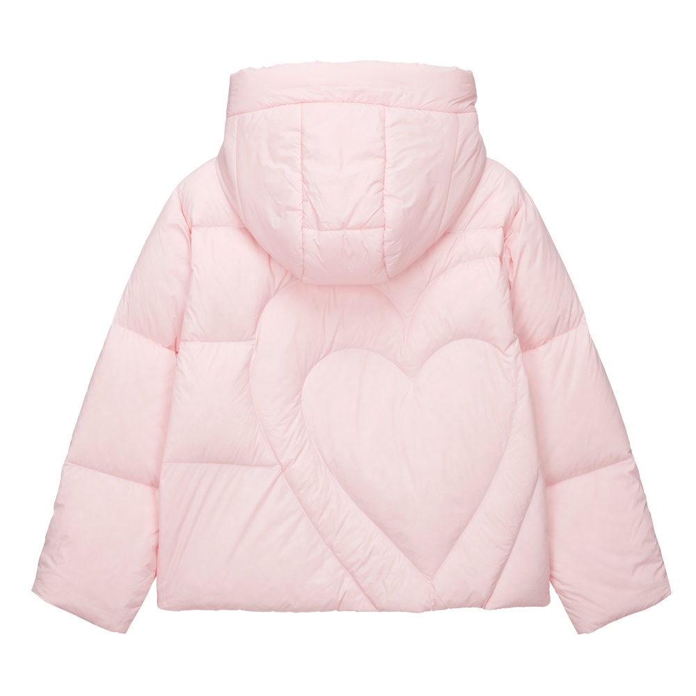 뒷판에 하트 패턴의 스티치가 적용된 발랄한 무드의 여아 숏 다운 자켓