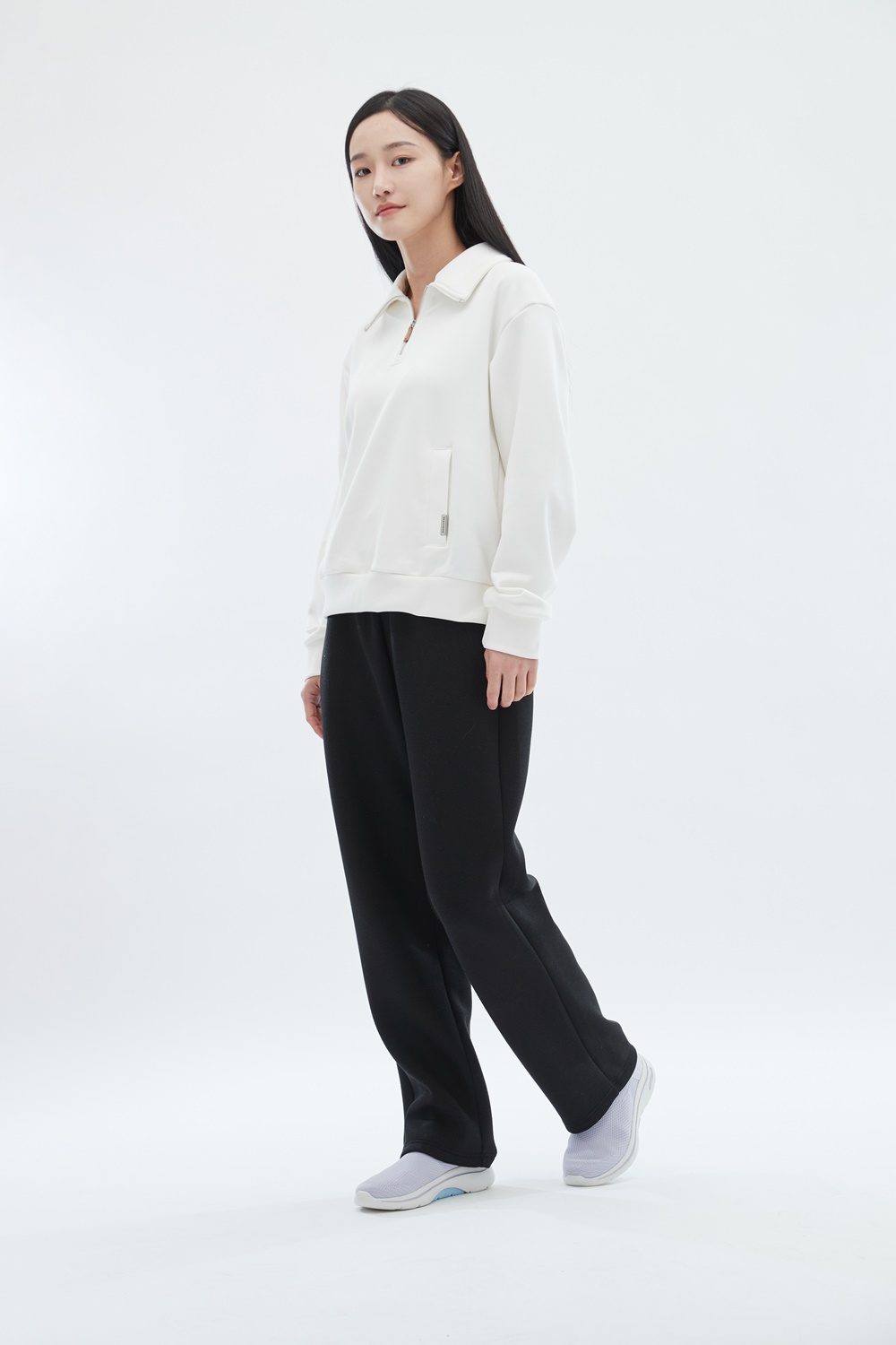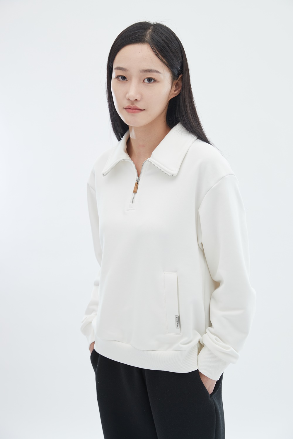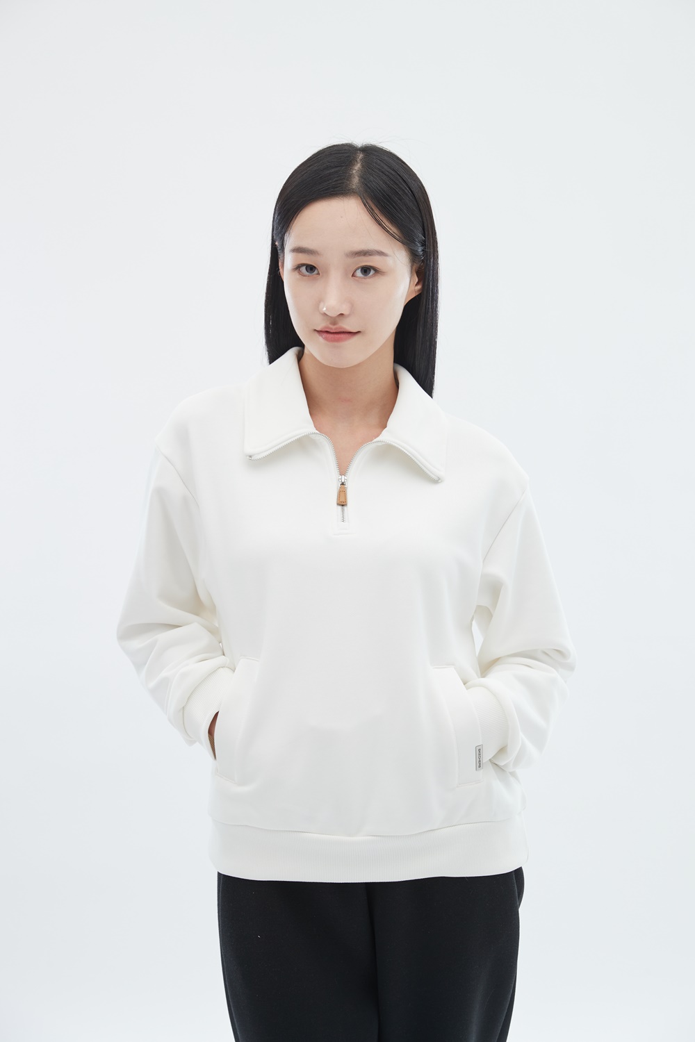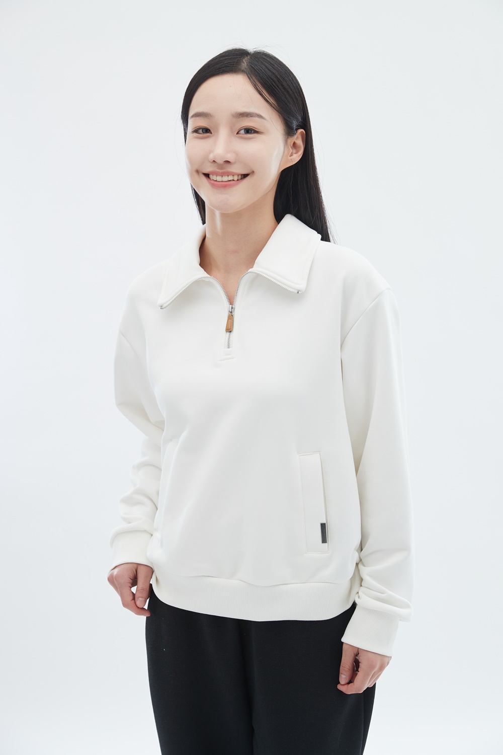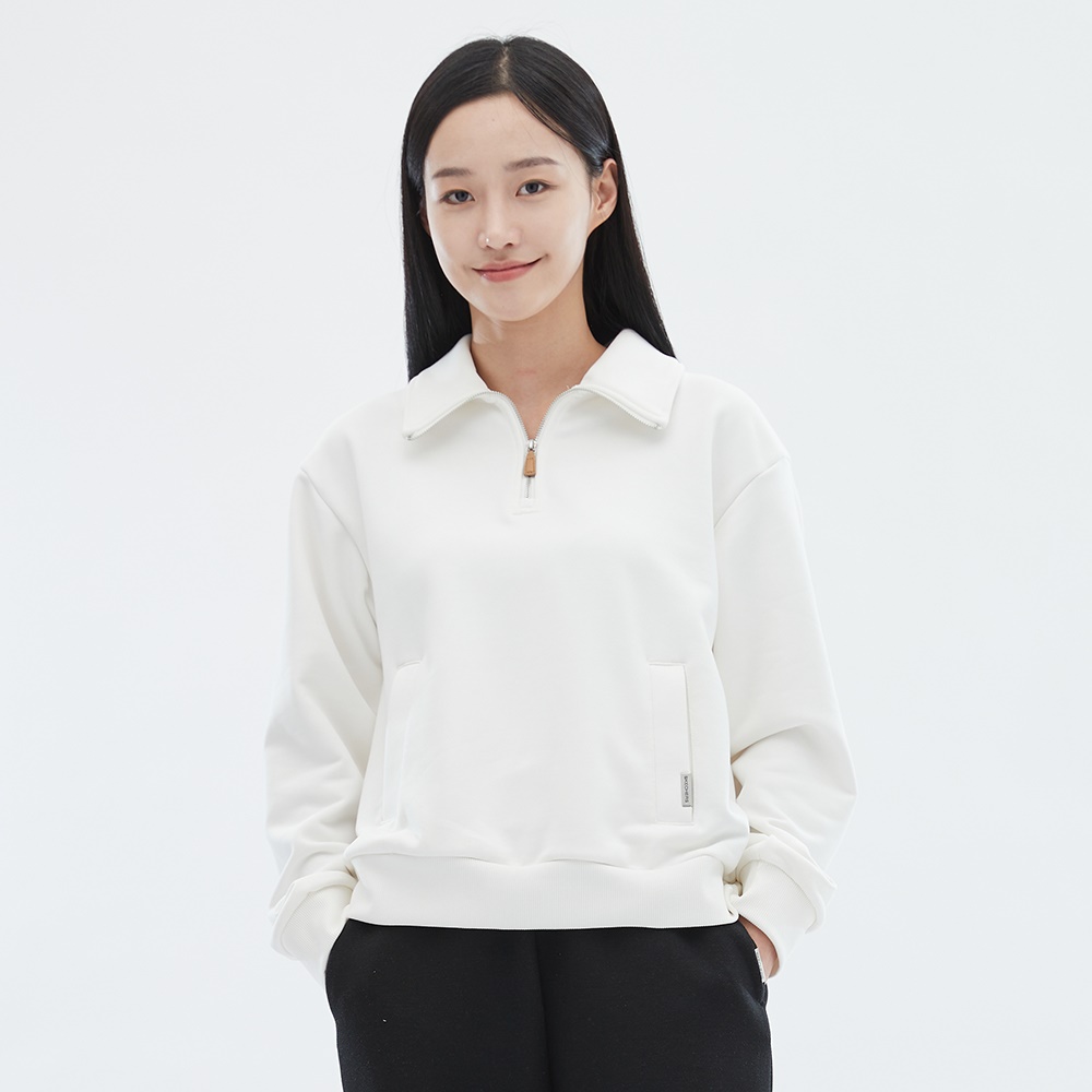 하프 집업 스타일로, 상황에 따라 지퍼 길이를 조절하여 착용 가능