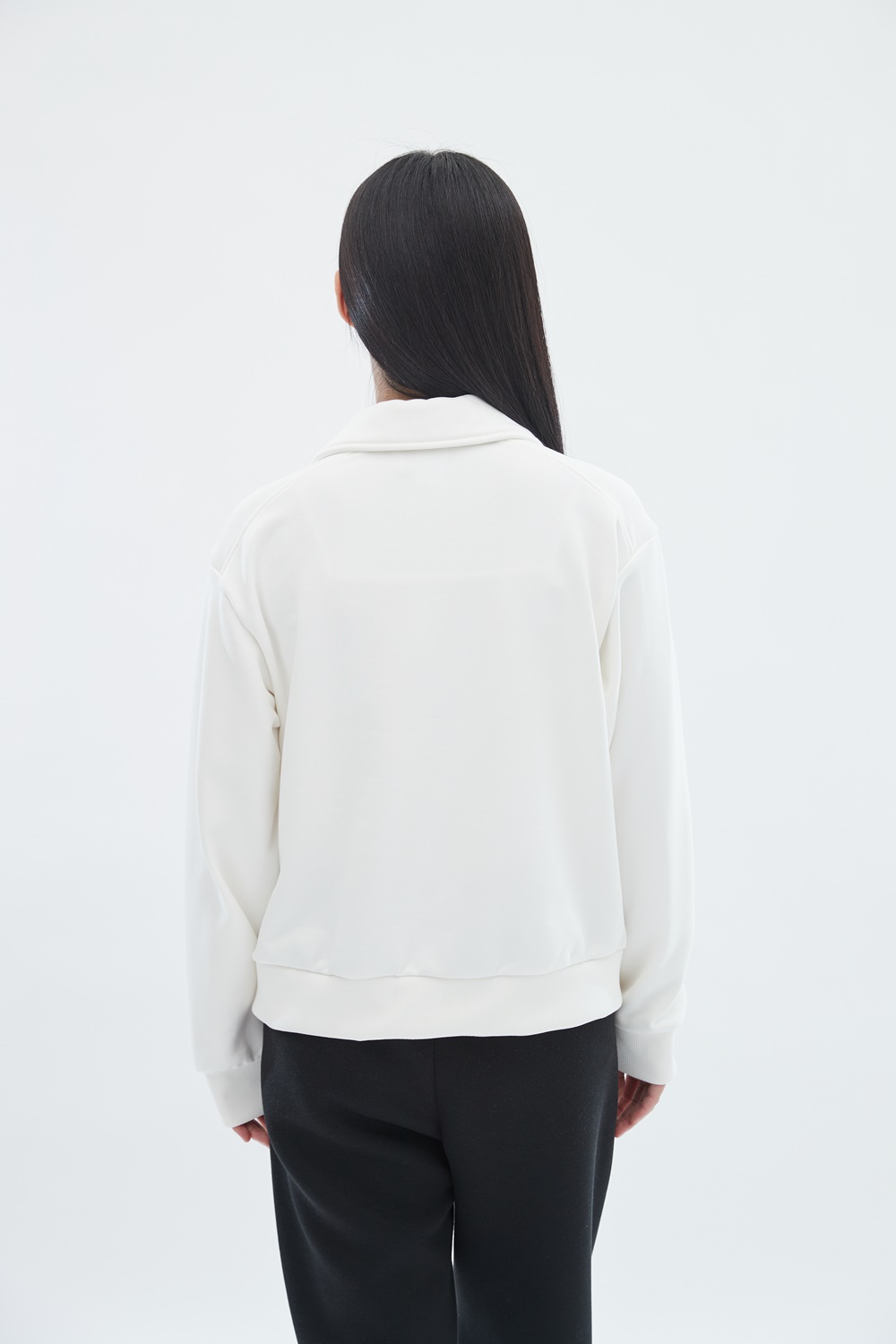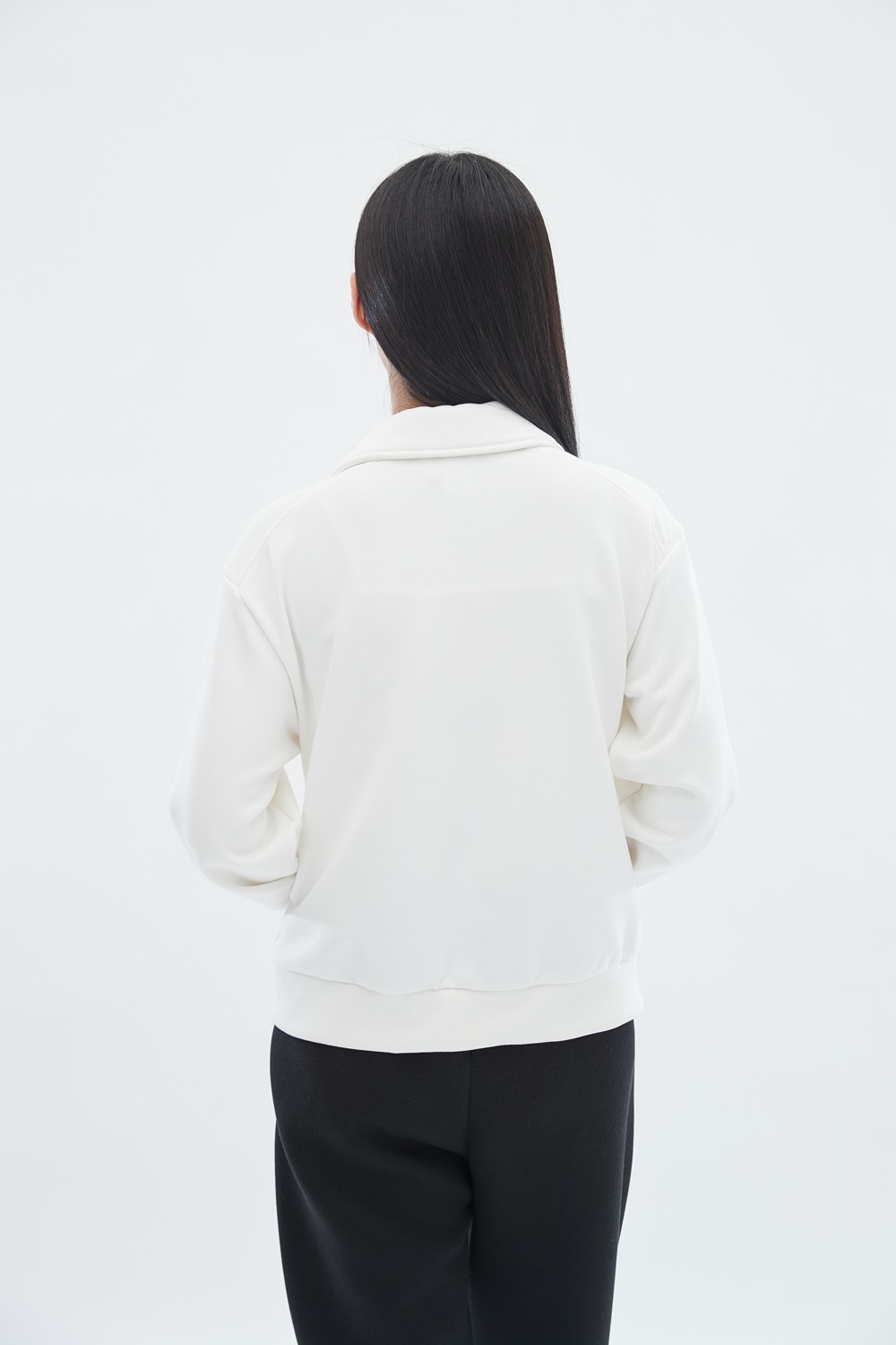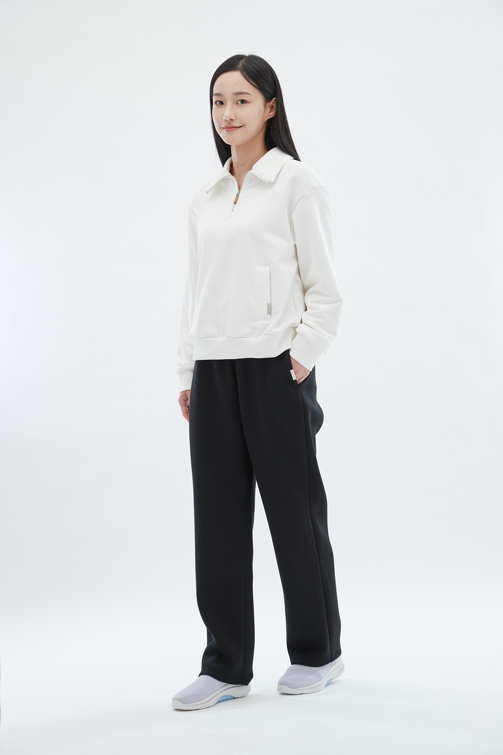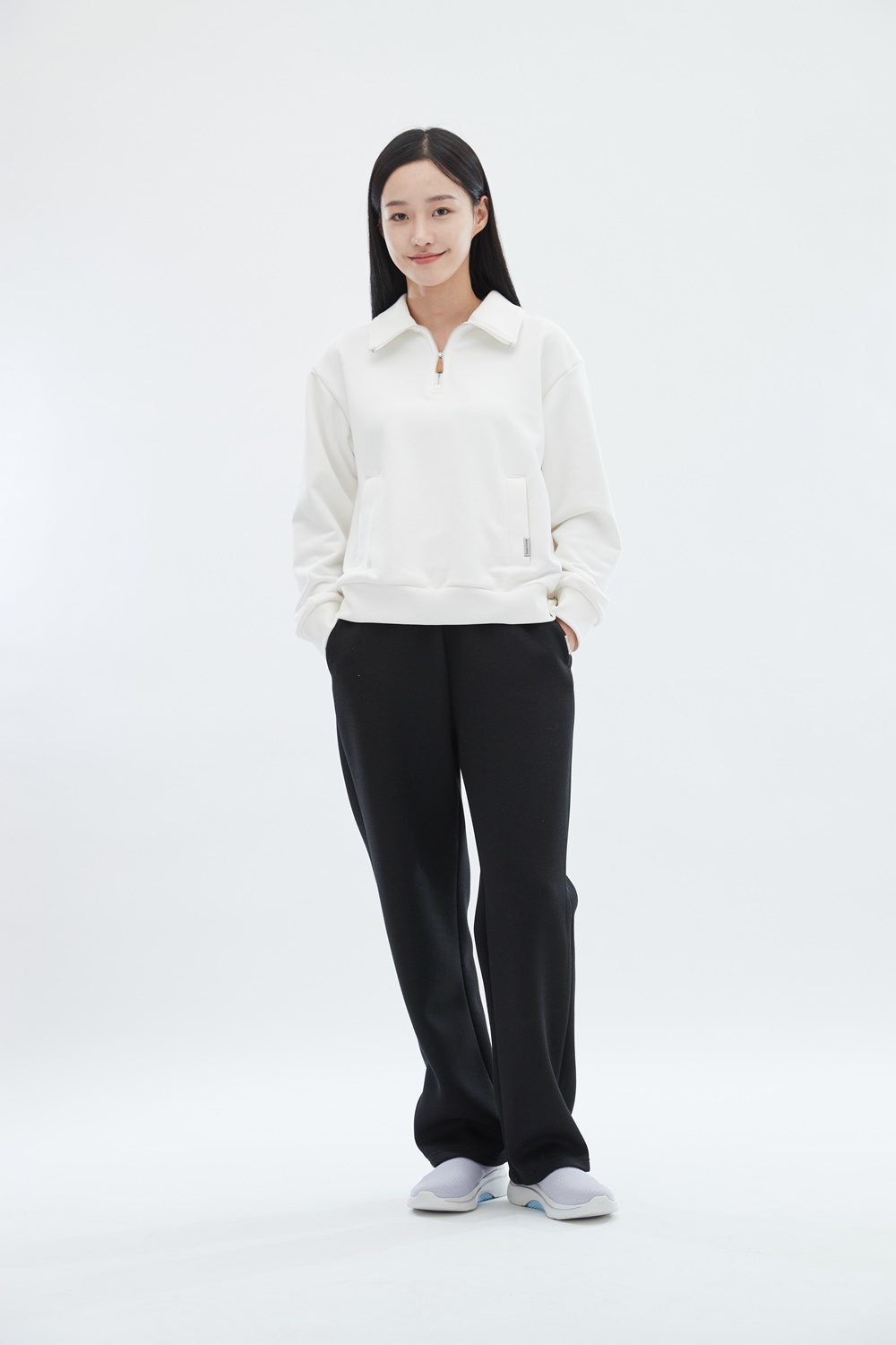 하프 집업 스타일로, 상황에 따라 지퍼 길이를 조절하여 착용 가능